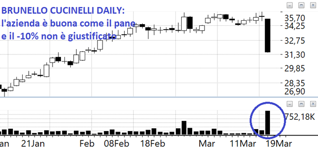 BRUNELLO CUCINELLI: l’azione presenta un bilancio ottimo anche se in leggero calo rispetto alle aspettative e il mercato la punisce con un -10%. Da comprare per i più sgamati sperando nel recupero (come è successo con Campari la scorsa settimana). Dovrebbe fare il minimo lunedì e poi riprendersi