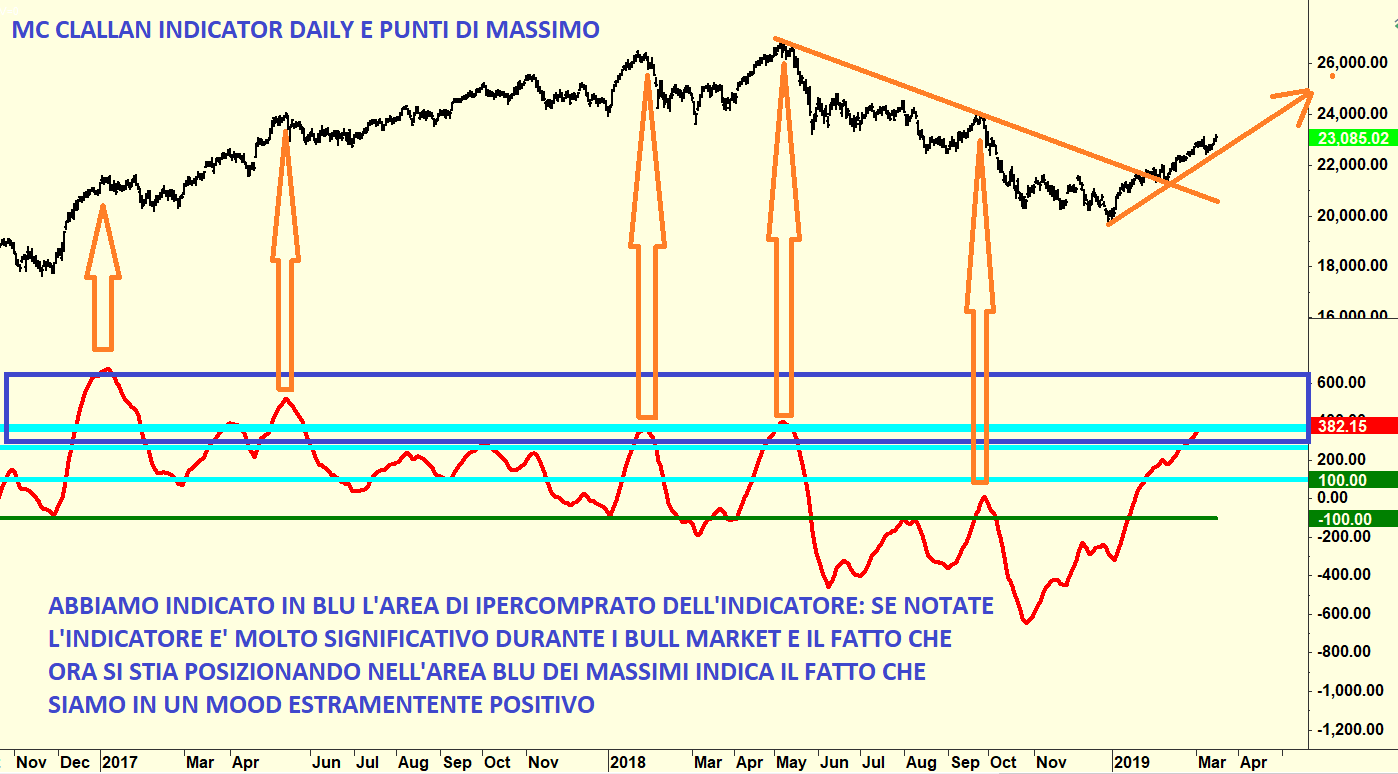 L’indicatore McClellan rialzi e ribassi sta arrivando in una area di ipercomprato se lo si vuole vedere da un lato timoroso del mercato oppure se lo si vuole vedere dal lato opposto di chi invece è entusiasta di questo ritorno di fiamma sta arrivando in una area dove il rialzo è sano. Ovviamente ogni rialzo è fatto di avanti ed indietro e quindi non ci starebbe male, arrivati a questo punto, anche un salutare ritracciamento, magari dopo un avvitamento all’insù in modo da lasciare spazio agli orsi di correre senza farsi male.