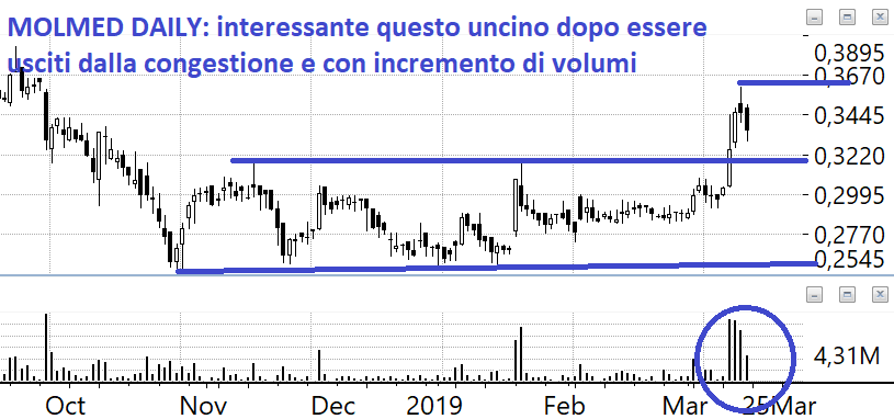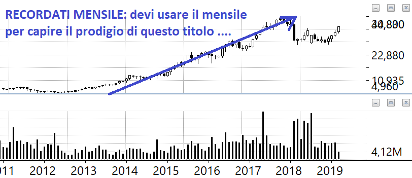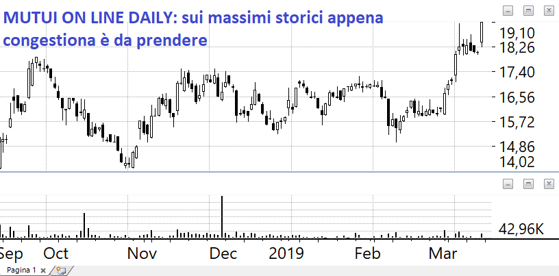 MUTUI ON LINE: spettacolare breakout di congestione stretta con barra assolutamente imprevedibile. Tenete conto che il trend di Mutui On Line è stato quanto di più rumoroso ci potesse essere sul mercato ed abbiamo avuto una congestione orizzontale sul mensile durata anni annorum. Se almeno due altre barre dovesse confermate il ritorno di direzionalità e volatilità è un titolo assolutamente da cavalcare.