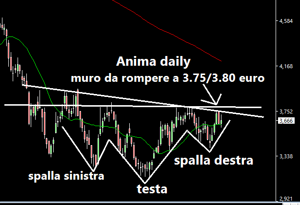 Il 16 Febbraio scrivevo: Il titolo è rimasto un po' fermo rispetto alla performance delle varie cuginette (Fineco, Banca Generali, Banca Mediolanum). Per gli amanti dell'esoterismo (visto che non ha validità statistica) abbiamo un potenziale testa e spalle rialzista. Area chiave da rompere con forza è a 3.75/3.80 euro, poi si valuterà.