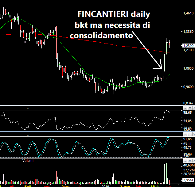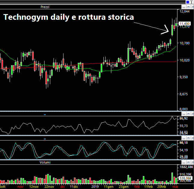 Il titolo sta rompendo una lunga congestione/triangolo simmetrico e venerdì scorso ha chiuso in area 1.56 euro per azione. Anche in questo caso ciò che più balza all'occhio sono i volumi scambiati sul daily. Un primo target lo colloco in area 1.65. Il rialzo è dovuto al fatto che Giovanni Tamburi, che gode di grande stima nel mondo finanziario, ha investito 75 milioni di euro per l'acquisto del 17.8% del gruppo di abbigliamento, salendo così al 22%, dopo che a Dicembre 2018 aveva acquistato circa il 4.9%, invertendone di fatto i corsi. Ero davanti al pc e credetemi quando vi dico che le vendite erano vorticose e mi ricordavano certi crack degli anni passati. Ma contestualmente c'era sempre una manona che comprava o comunque si faceva eseguire senza problemi. Altrettanto onestamente Vi dico che non mi sono sentito di operare in quel momento. Ad ogni modo, anche adesso, è un titolo poco adatto a pazienti che soffrono di insonnia e/o ipertensione.