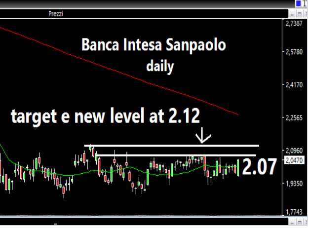 Abbiamo iniziato l'articolo di oggi dall'inesistente Santo di nome Remo per poi passare a San Valentino. Adesso siamo a Sanpaolo. Quello che noto è che il titolo mi sembra rimasto un po' in sordina e nel dimenticatoio rispetto alla performance di altri bancari. Per ora siamo fermi al piano 2.047, ma se si salisse fino al successivo 2.07, la rottura potrebbe portare il santo ad un piano ancora superiore (area 2.12 ).