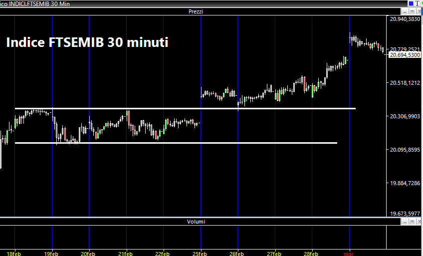 Finalmente è stata rotta la estenuante congestione della settimana precedente, quella dal 18 al 22 Febbraio per intenderci. Come spesso capita questa rottura ha portato ad una repentina accelerazione rialzista che si è concretizzata nell'ultima seduta settimanale con un gap in open, ricoperto sul finale di seduta.