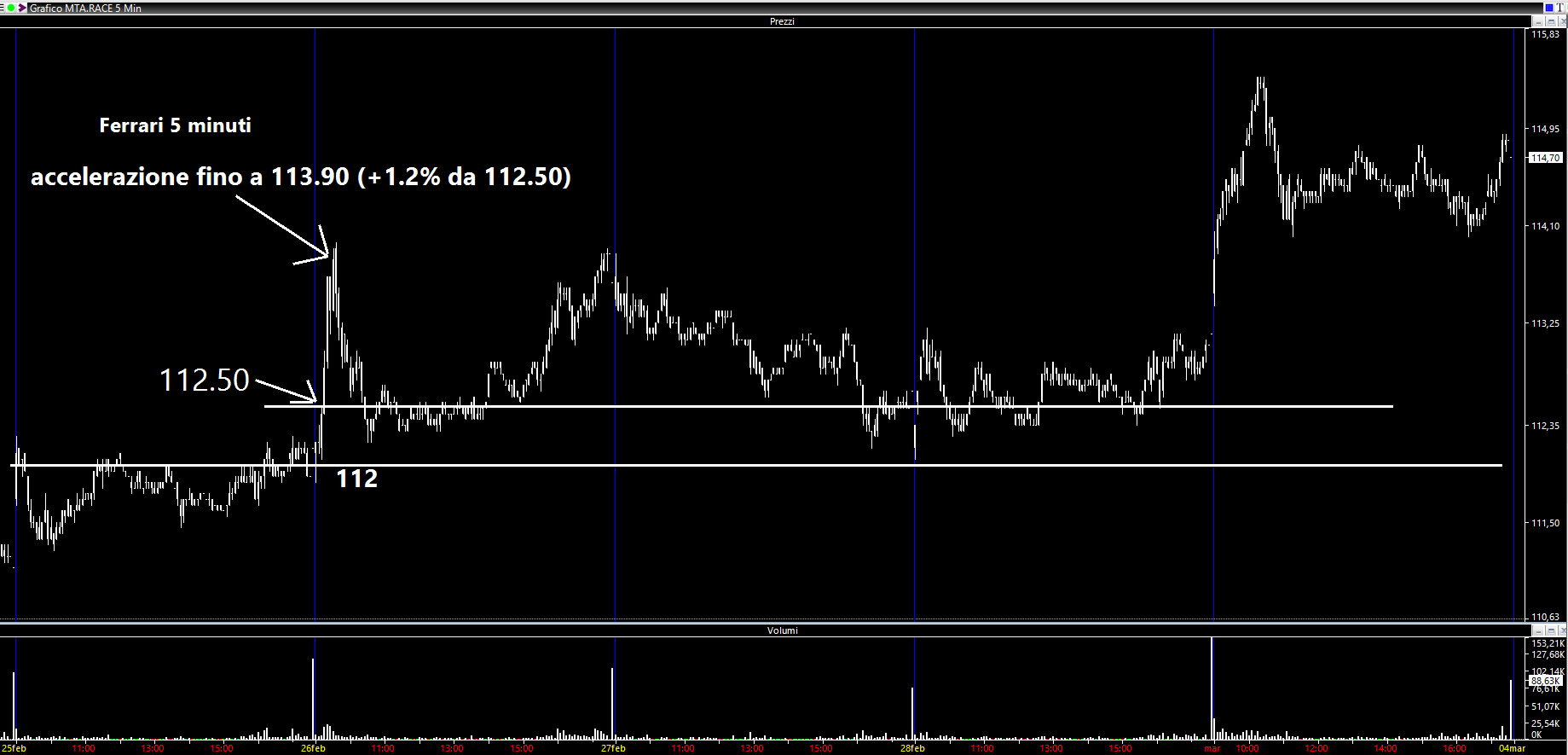 Il titolo presentava una lapalissiana formazione triangolare ed avevo indicato l'area 112.00/112.50 come area valutativa per una potenziale accelerazione del Cavallino. Apro una parentesi. La storia di questo Cavallino nasce dal fatto che lo stemma era dipinto sulla carlinga di un caccia di un aviatore durante la prima Guerra mondiale ed Enzo Ferrari, al termine di una gara automobilistica, conobbe il padre di quell'aviatore che successivamente consegnò lo stemma come portafortuna.