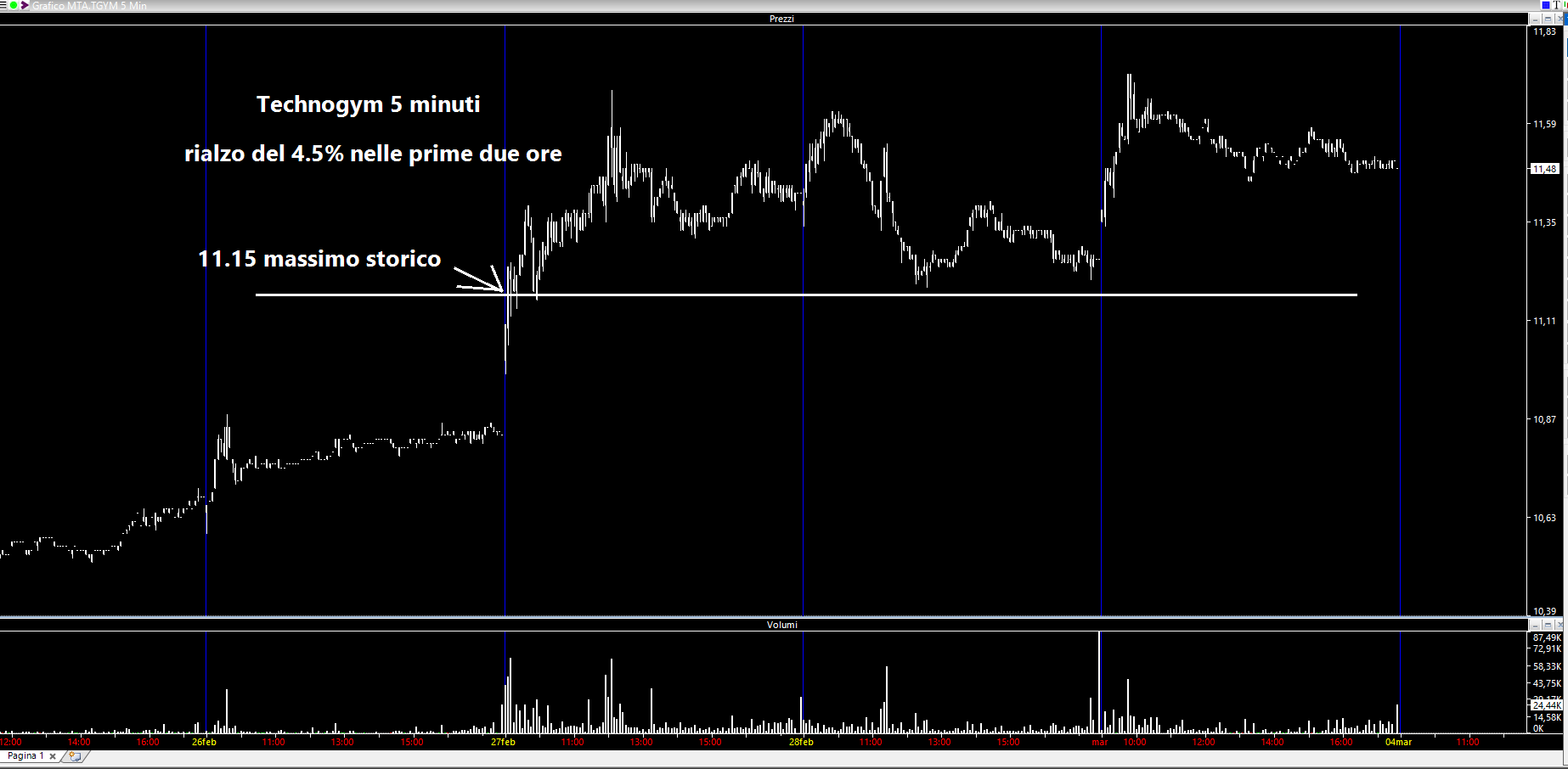 Prendendo il microscopio vediamo che la rottura in breakout di 11.15 euro ha portato ad un rialzo del 4.5% nelle prime due ore di contrattazione. Vedremo nelle prossime settimane dato che la rottura è avvenuta con buoni volumi e siamo sopra i massimi storici. Sicuramente la terrò in watchlist. Ma mai farsi dei film, solo avere delle semplici idee!