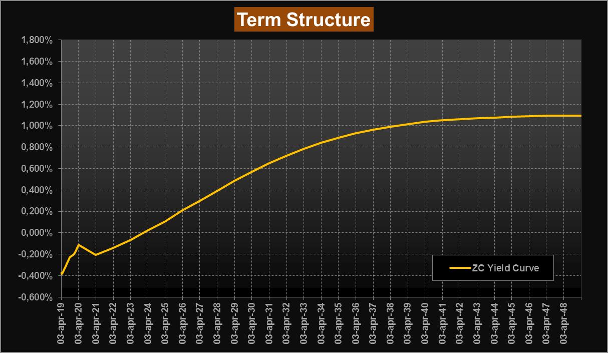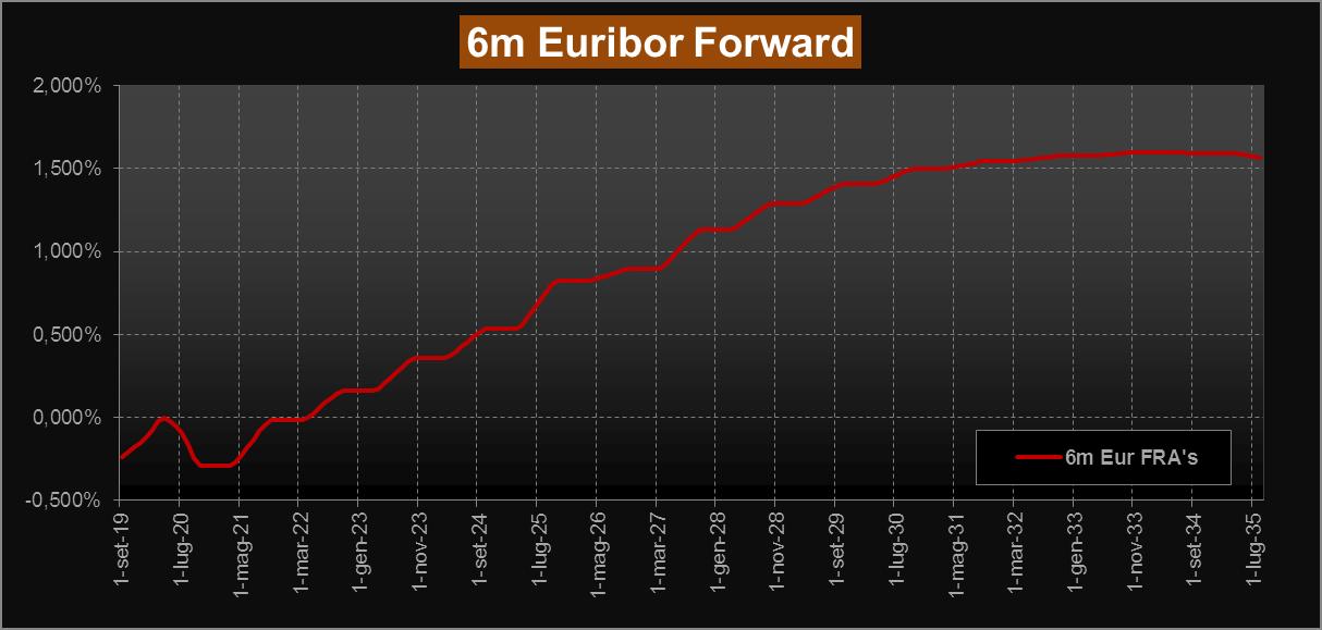 Passando alle nostre analisi, con la nostra consueta lettura del mercato obbligazionario attraverso la ZC-Yield Curve, registriamo questa settimana rendimenti impliciti ancora in discesa rispetto alla scorsa rilevazione, con il tratto a lunga ora ben sotto area 1,10% sino alle scadenze 2049; sulla scadenza a 10 anni si scende in area 0,48%. Si appiattiscono anche i forward su Euribor 6 mesi sul tratto a lunga che si portano sotto area 1,60%, mentre sul tratto a breve non si registrano particolari variazioni.