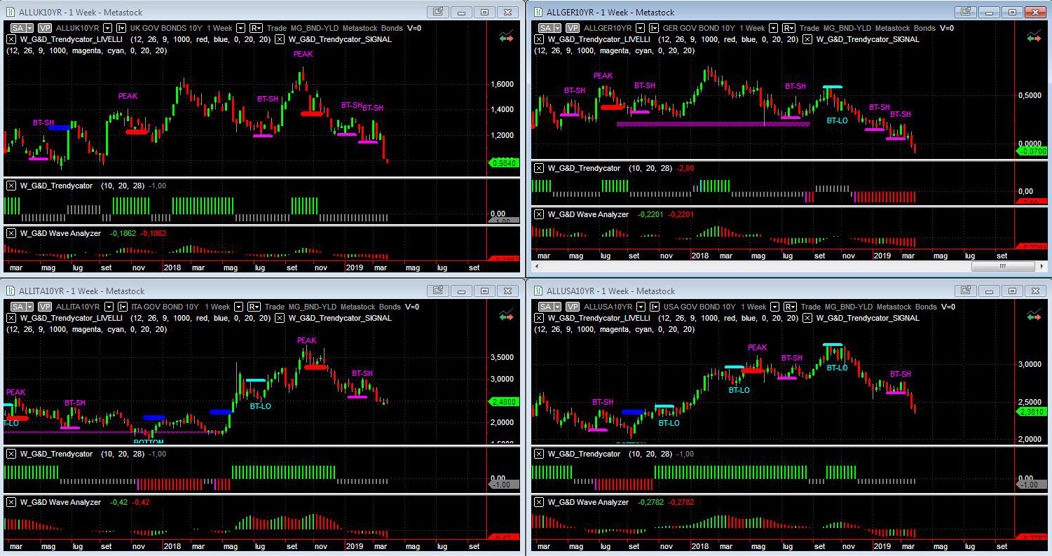 Osservando – a livello di analisi integrata – le curve dei rendimenti dei benchmark decennali dei principali mercati è sempre più netta la situazione delineatasi già tempo addietro con le prime evidenze del modello Trendycator. Il modello rimane NEUTRAL sull’area UK, con il Gilt che sfonda pesantemente a va sotto area 1,00% di rendimento; sull’area BUND Trendycator sempre saldamente SHORT con il rendimento che ritocca i minimi e crolla a -0,06%. Il Btp ha Trendycator confermato su NEUTRAL con il consolidamento della netta discesa del rendimento che prosegue in area 2,40%-2,50%. Sfondone anche per i rendimenti dei governativi USA, con Trendycator sempre NEUTRAL e rendimenti ora su nuovi minimi del 2019 ora sotto area 2,40%.