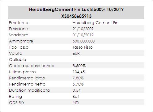 Il bond HY che analizziamo oggi è un tasso fisso della Heidelberg Cement Finance, braccio finanziario della Heidelberg Cement quotata sulla Borsa di Francoforte. La società non ha bisogno di presentazioni essendo una delle principali aziende mondiali produttrici di materiali da costruzione; opera in cinque continenti e i prodotti sono utilizzati per la costruzione di case, infrastrutture, strutture commerciali e industriali. Le attività principali comprendono la produzione e la distribuzione di cemento, inerti, calcestruzzo e asfalto.