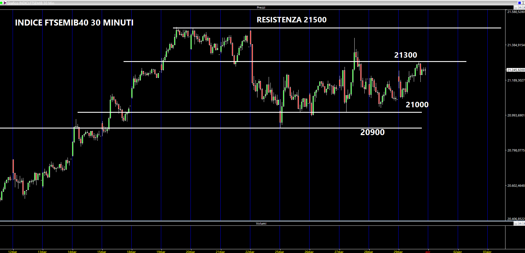 A livello di indice italiano ho individuato delle aree supportili a 21000 punti con possibili affondi a 20900, mentre credo che sia interessante osservare il baricentro in area 21300, la cui rottura confermata ci potrebbe portare al test chiave dei 21500. Qui sotto trovate un grafico a 30 minuti.