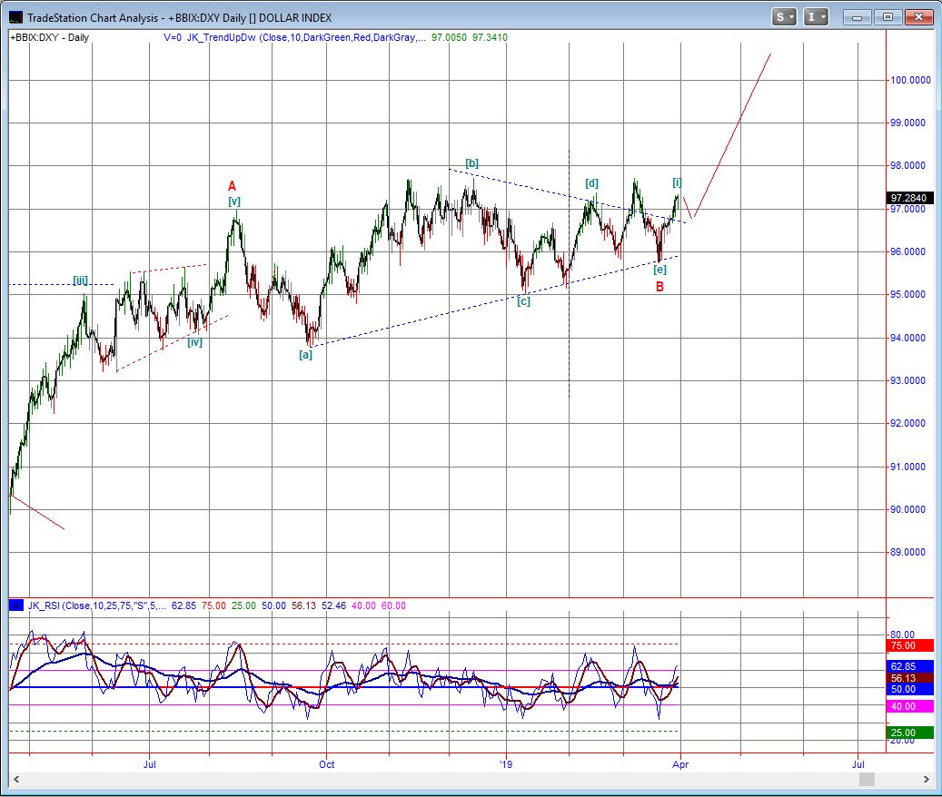 Oggi iniziamo quindi dai Bond americani: visto come sono andate le cose graficamente (avvallate anche dal grafico a due ore in cui l’onda [c] appare in tutto il suo splendore), tenuto conto che sul Daily Sentiment Index si è toccato, nella seduta di giovedì, il 93% di tori, e tenuto conto che sei chiusure al rialzo sulle obbligazioni non si vedevano da 16 mesi, ci sono tutte le condizioni che accompagnano di solito l’esaurimento di un trend e quindi la nostra conclusione, anche se nessuno sembra pensare che questo sia possibile, è che la tendenza sta girando nuovamente sul trend principale che è ribassista da diverso tempo, e pertanto i prezzi delle obbligazioni scenderanno, con l’onda 3, mentre aumenteranno i rendimenti.