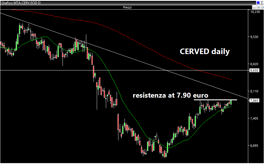 Titolo più volte monitorato su queste colonne. Come avevo già detto, il primo target era già stato raggiunto, anche se, teoricamente, avendo rotto i massimi storici, continua ad avere buone potenzialità per ulteriori allunghi. Da valutare in caso di rialzo verso gli 11,60. In settimana mi ha offerto un ottimo trade. Faccio notare che ha chiuso il gap ed ha effettuato un retracement sul precedente massimo in area 11,15, dove del resto il titolo continua a gravitare.