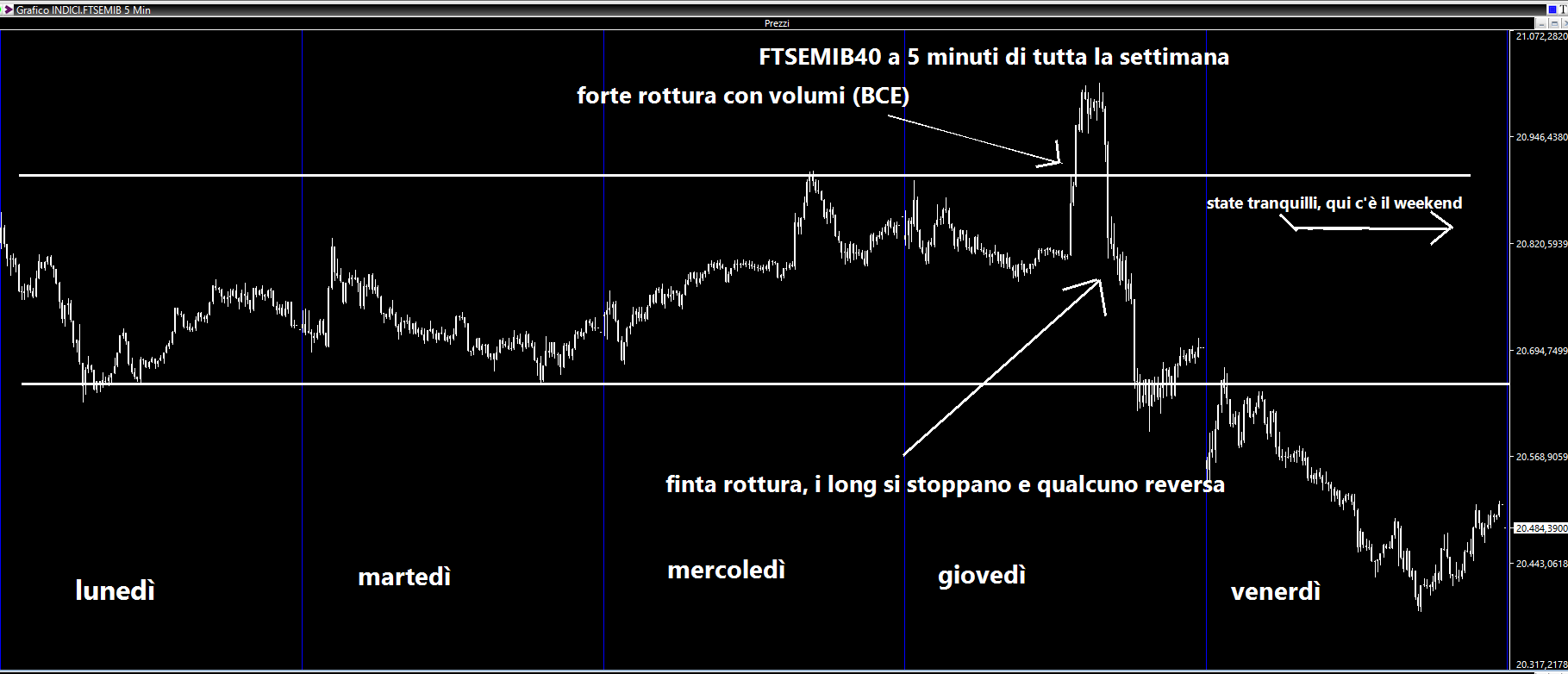 La settimana è iniziata tutto sommato in modo abbastanza tranquillo, con una relativa mancanza di volatilità, almeno fino alla giornata di giovedì. Spesso le grandi occasioni (meeting di Banche Centrali ad esempio) sono un momento utile per far strappare il mercato in una direzione piuttosto che in un'altra. Talvolta però, come in questo caso, abbiamo assistito ad una bellissima rottura rialzista verso le ore 14.00 di giovedì, seguita poco dopo da una repentina inversione di rotta. Dal vento in prua, utile a virare, a quello in poppa, utile a strambare. Occhio al boma e alle teste però, altrimenti rischiate la decapitazione. Naturalmente molti sono entrati long, salvo poi ricredersi poco dopo, dovendosi stoppare. La terza legge della dinamica, in fisica, dice che ad ogni reazione ne segue una uguale e contraria e sui mercati capita un po' la stessa cosa. La maggior parte dei compratori ha chiuso in pari o in perdita. I più esperti ne hanno approfittato per buttare ancora più giù il mercato vendendo al rientro in congestione. Questo movimento non poteva che proseguire nella giornata di Venerdì. Quello che ho notato è stato che le vendite sono state tendenzialmente lente e a goccia come dico io. Sarà stata la pessima giornata per l'Asia piuttosto che l'indebolimento di TUTTA la settimana in America? Poco importa in questo momento.