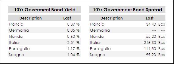 Qualche movimento, seppur marginale, sui rendimenti dei benchmark decennali e degli spread rispetto alla scorsa rilevazione. Il decennale tedesco prosegue la risalita dai minimi dell’anno e si riporta in teriirotrio postivo (0,05% attuale contro 0,00% della scorsa rilevazione), la Francia va allo 0,39% e l’Irlanda va a 0,60%. Scendono un po’ i rendimenti dei periferici, con il nostro Btp che scende in area 2,50% di rendimento, mentre il Portogallo va a 1,17% e la Spagna va all’1,04%. A livello di spread Vs Bund abbiamo Portogallo, Spagna e Italia rispettivamente a 112 bps, 99 bps e 246 bps.