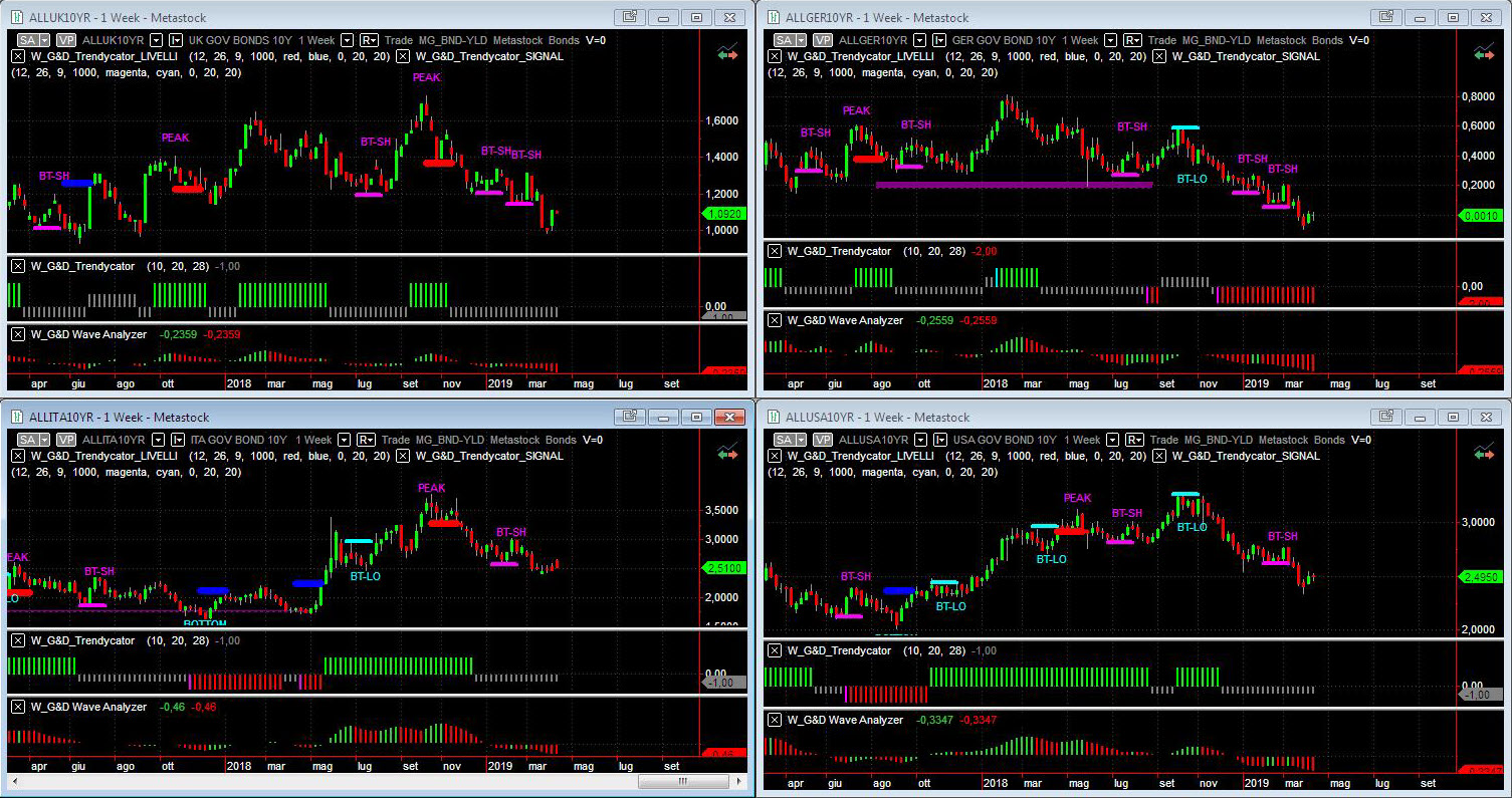 Osservando – a livello di analisi integrata – le curve dei rendimenti dei benchmark decennali dei principali mercati si conferma l’impostazione di medio termine. Il modello rimane NEUTRAL sull’area UK, con il Gilt che consolida sopra area 1,00% di rendimento; sull’area BUND il Trendycator è sempre SHORT ma il rendimento risale dai minimi e si porta tra 0,00% e 0,05%. Sul Btp Trendycator è ancora NEUTRAL con il consolidamento del rendimento che prosegue in area 2,50%. Fine del rimbalzo per i rendimenti USA con Trendycator sempre NEUTRAL e rendimenti sempre in area 2,50%.