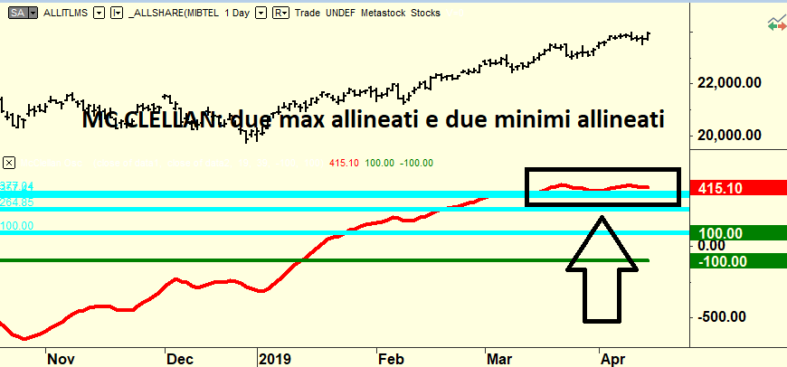 Non è possibile fare una somma algebrica di più o di meno perché non funziona così. Il consiglio operativo è molto semplice: se l’indice rompe quota 24.000 del Ftse All Share in chiusura potremo avere l’inizio di un nuovo ciclo positivo ma il Mc Clellan deve riprendere a crescere perché è la benzina del mercato. Altrimenti piuttosto che un ribasso avremo una fasce di oscillazione orizzontale che potrebbe durare fino ad agosto e quindi un ulteriore rialzo.