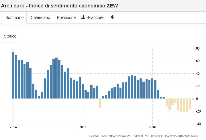 Del resto anche l’indice ZEW dell’area Euro già presentato ai lettori in report precedenti, continua a viaggiare in territorio negativo da Aprile dello scorso anno come si vede nel grafico sottostante.