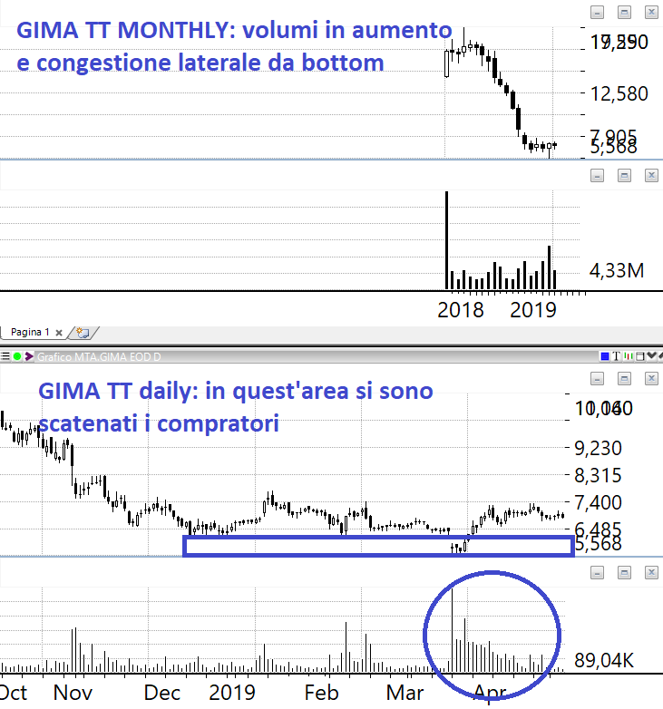 GIMA TT: ha un ROE spettacolare nel 2018 roba da film fantascientifico. Se notate siamo sul supportone che non verrà probabilmente mai infranto. Sarebbe da accumulare, guardate il movimento dei volumi opposto a quello dei prezzi, più scendeva più diventava appetibile.