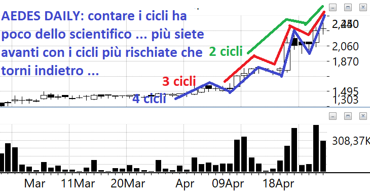 AEDES: alcuni lettori mi hanno chiesto dei 3 movimenti. Sarebbe falso dire che esiste una regola precisa, io di solito conto gli unicini ovvero le onde e qui se contiamo gli uncini siamo a 2 o 3 dipende da come volete fare gli artisti. I movimenti di solito avvengono per gradi e di solito ce ne sono 3 dove di solito esprime bene il concetto che lo sai sempre solo alla fine. Chi ha comprato bene lunedì oggi può smobilitare e così taglia la testa al toro.