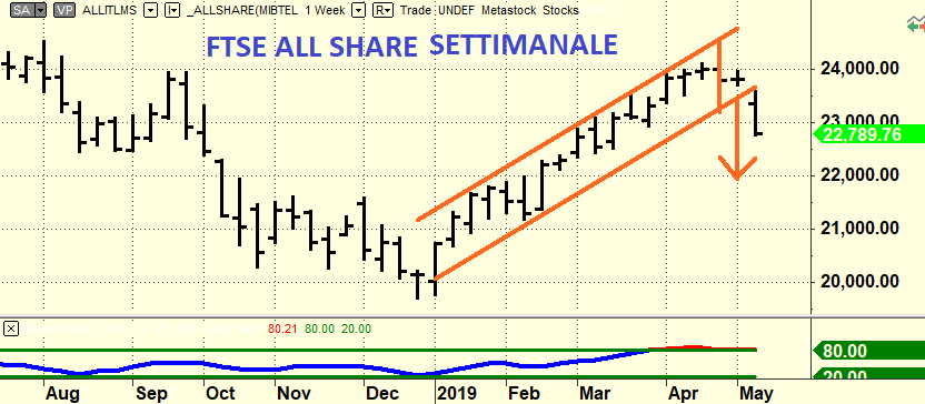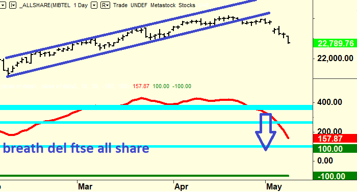Una notizia positiva viene dall’analisi grafica: come detto a suo tempo quando i rialzi sono impostati in maniera regolare come questo l’obiettivo del ribasso in caso di sfondamento della trendline è molto semplice ed è dato dalla proiezione della distanza tra punto massimo e punto minimo durante il rialzo proiettato dal punto di rottura. Se adottiamo questa tecnica per proiettare il punto di arrivo del ribasso (tecnica che finora ci ha sempre regalato delle soddisfazioni, sembra magia ma purtroppo è così) l’obiettivo del ribasso è a quota 22.000 e da quel punto inizierà la penosa congestione estiva (e il safari del titolino).