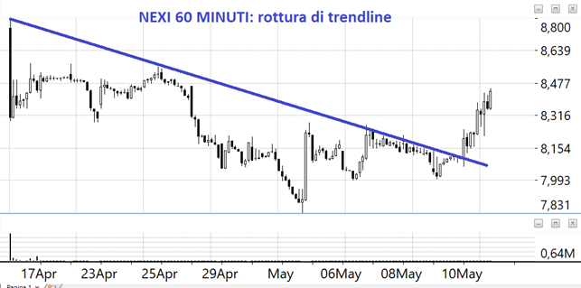 Altro titolo tornato interessante è stato Nexi che è stata comprata a piene mani e ha rotto una specie di trendline ribassista. Da monitorare attentamente pronti a comprare alla rottura dei massimi del collocamento.