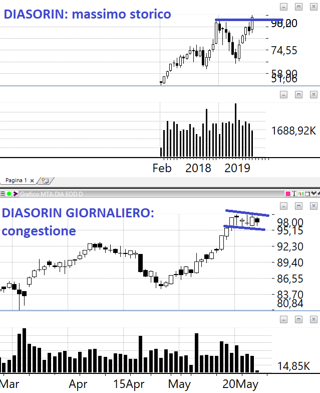 DIASORIN: c’è poco da fare, congestione stretta poco sopra i massimi storici. Forza relativa crescente, una trimestrale 2019 con i fiocchi. Dobbiamo comprare: buy 98 stop sul massimo della congestione. Stop loss molto vicino.