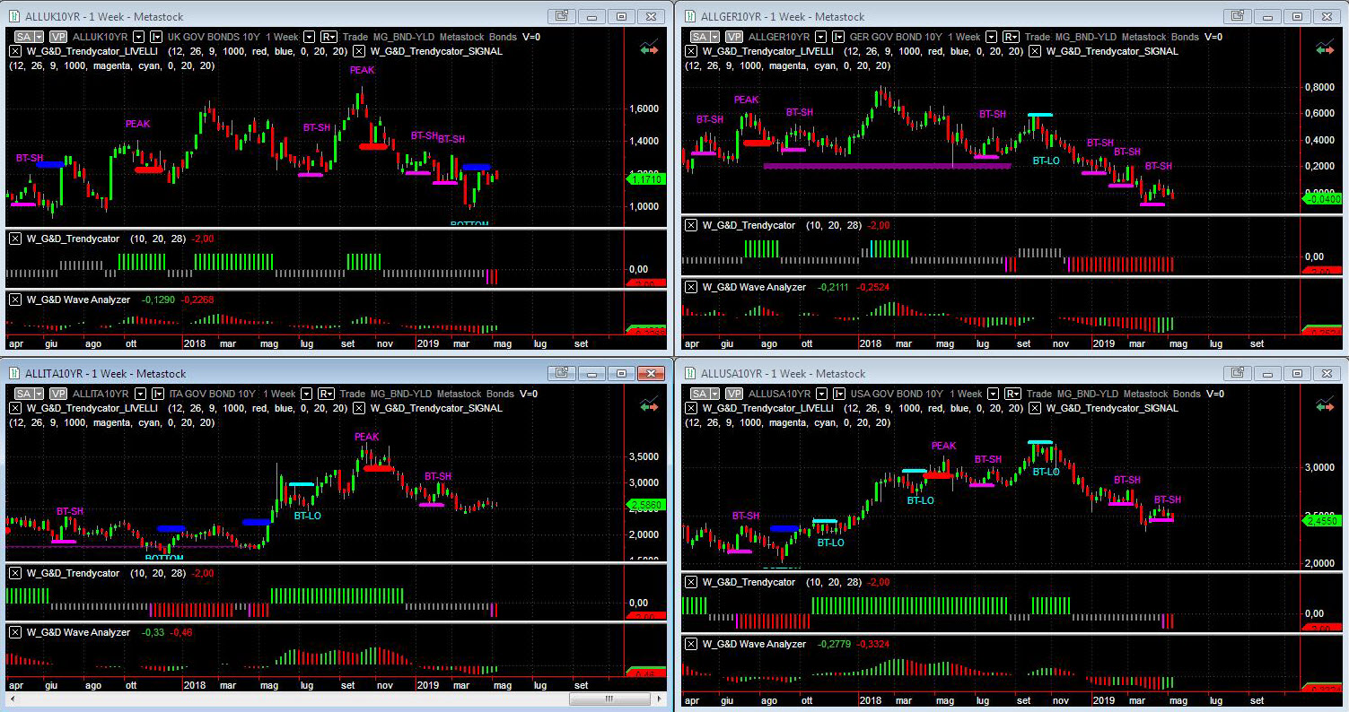 Osservando – a livello di analisi integrata – le curve dei rendimenti dei benchmark decennali dei principali mercati notiamo un bel cambiamento di impostazione per il medio termine. Infatti il modello è ora short su tutti e quattro i benchmark decennali, mentre prima lo era solo per il Bund. E così si porta SHORT sull’area UK, con il Gilt che dopo essere sceso sotto l’1% è ora rimbalzato verso area 1,20% di rendimento; sull’area BUND il Trendycator è sempre SHORT e il rendimento rivede i minimi e si riporta in negativo a -0,04%. Sul Btp Trendycator passa SHORT nonostante le nuove lievi pressioni sul nostro debito, ma di fatto sempre in consolidamento tra area 2,50% e 2,60%. Tornano a scendere anche i rendimenti USA con Trendycator che passa anche qui in configurazione SHORT e rendimenti ora nuovamente sotto area 2,50%.