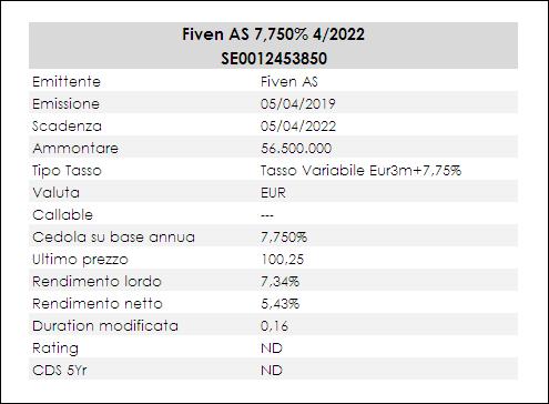 Il bond analizzato è un tasso variabile, la cui cedola è pari ad Eurobor 3 mesi più uno spread del 7,75% che di fatto lo rende un tasso fisso (Euribor negativo) dalla cedola generosa. Collocato a 100,00 ad aprile 2019, ISIN SE0012453850, corrisponde una cedola annua del 7,75% pagata trimestralmente. Emesso per un ammontare di 56,5 Mln Euro, rimborso previsto in unica soluzione alla pari il 05.04.2022. Il bond è negoziabile su OTC per importi minimi di 1.000 Euro.
