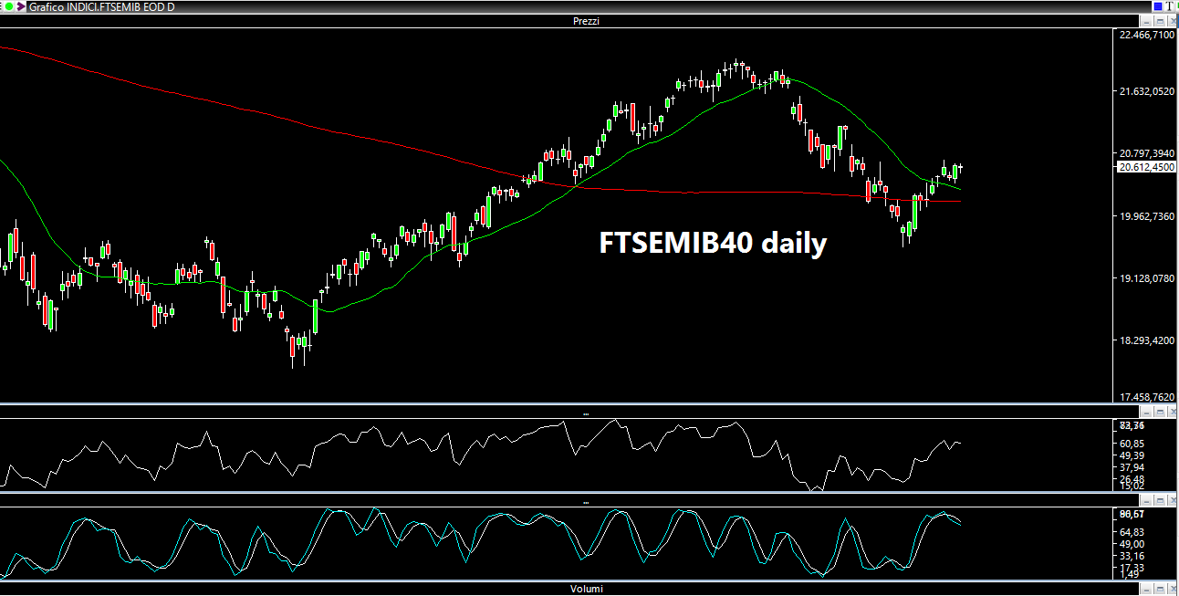 I punti indicati sull' INDICE S&PMIB40 erano: 20000 nella parte bassa e 20700 nella parte alta. Siamo stati molto precisi, visto che il massimo settimanale (assoluto e relativo) è stato toccato Martedì proprio a 20704,58 punti, con uno "sforamento" dello 0.022%. Nell'ottava passata avevo intitolato l'articolo "La gatta morta". Il fatto di esserci allontanati ulteriormente dai minimi di fine maggio propende a favore di una interruzione (parziale per ora) del trend ribassista iniziato a fine Aprile. Gli aspetti positivi a mio avviso (sul mercato italiano naturalmente) sono che ci siamo allontanati dalla media a 200 ed in parte anche dalla media veloce a 20 periodi, come potete notare nel seguente chart daily