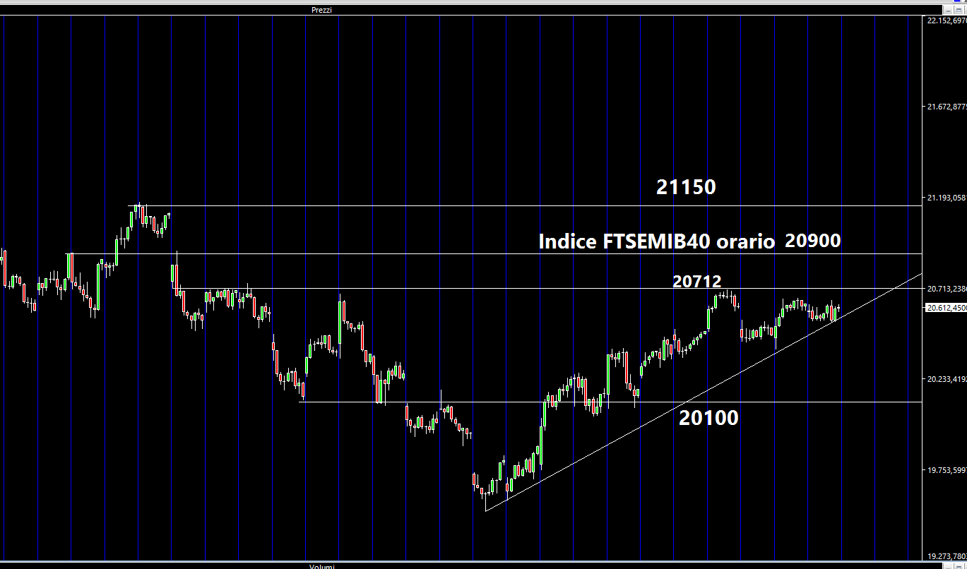 A questo punto osserviamo un grafico orario del principale indice italiano che raggruppa le prime 40 società ad elevata capitalizzazione. Colloco i nuovi supporti a 20100 punti al ribasso, mentre a livello di resistenze la principale si trova a 20712 e successivamente a 20900. Molto ambiziosi per ora i 21150 punti indice. Consideriamo inoltre che l'ottava entrante sarà caratterizzata dall'expiring dei derivati (opzioni su indici ed azioni) e dal rollover dei futures verso la scadenza settembre. Credo che assisteremo nuovamente a rialzi seguiti da improvvisi ribassi. Le mani forti del mercato dovranno trovare un equilibrio a seconda dello sbilanciamento delle proprie posizioni.