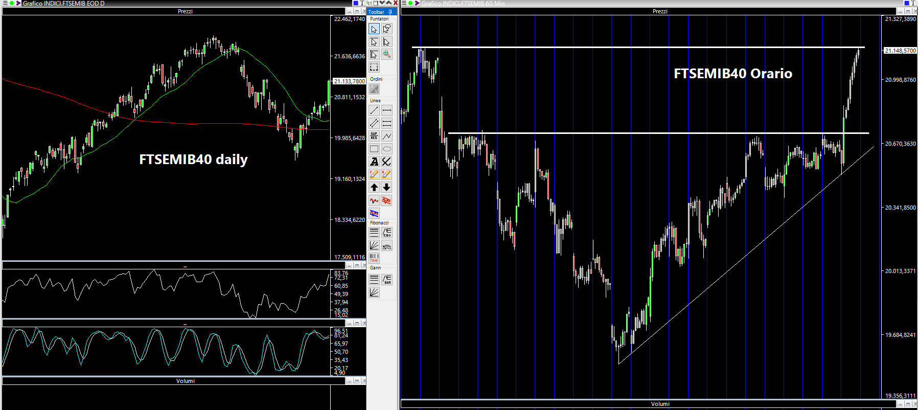 Veniamo al nostro indice FTSEMIB40. Nel mio articolo di sabato avevo indicato una prima soglia a 20712 (toccata ieri, visto che il massimo è stato a 20721,92). L'altra che avevo indicata nei 20150 punti è stata toccata oggi (massimo a 20156).