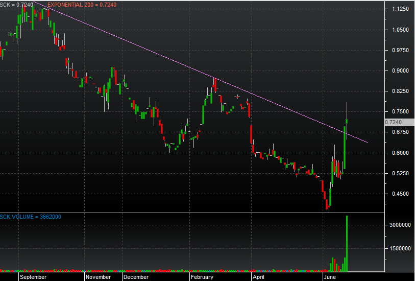 Esattamete durante il webinar, ci siamo soffermati su Sciuker Frames, azione che veniva già da giornate all'insegna di forte attenzione da parte dei trader che si erano avventati sul titolo, con una esplosione dei volumi di contrattazione, come ben visibile dal grafico.