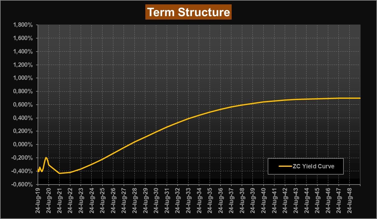 Passando alle nostre analisi, con la nostra consueta lettura del mercato obbligazionario attraverso la ZC-Yield Curve, registriamo questa settimana rendimenti impliciti sostanzialmente stabili rispetto alla scorsa rilevazione, con il tratto a lunga che rimane inchiodato ben sotto lo 0,70% incapace di salire nemmeno a partire dalle scadenze 2049; sulla scadenza a 10 anni si lima qualcosa in area 0,113%. Curva sempre bella piatta e sempre con rendimenti negativi sino alle scadenze 2027. Stabili i forward su Euribor 6 mesi che sul tratto a lunga permangono poco sopra area 1,10% e sul tratto a breve sempre immobili.