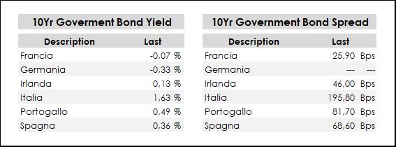 Sostanzialmente stabili anche gli spread contro Bund e i rendimenti dei governativi. Il decennale tedesco si mantiene robustamente in territorio ampiamente negativo (-0,33% di rendimento attuale contro -0,31% della scorsa rilevazione), la Francia va a -0,07% e l’Irlanda va a 0,13%. Stabili anche i rendimenti di Spagna, Portogallo e Italia con il Btp in area 1,63% di rendimento, mentre il Portogallo va a 0,49% e la Spagna resta allo 0,36%. A livello di spread Vs Bund abbiamo Portogallo, Spagna e Italia rispettivamente a 81 bps, 68 bps e 196 bps.