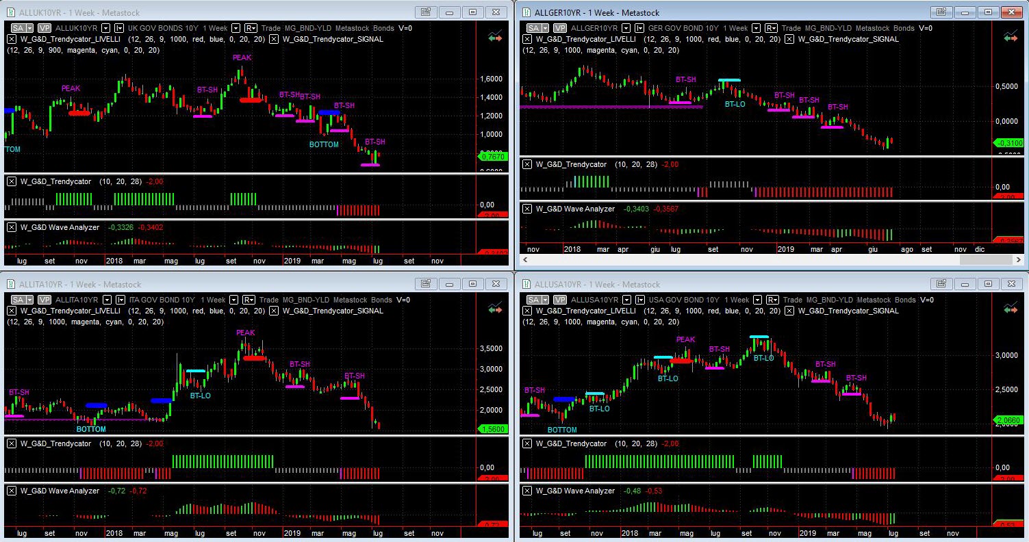 Osservando – a livello di analisi integrata – le curve dei rendimenti dei benchmark decennali dei principali mercati non si registrano novità degne di rilievo. Trendycator quindi saldamente SHORT su tutti i mercati analizzati, con l’area UK che vede il Gilt consolidare in area 0,76% di rendimento; sull’area BUND il rendimento si mantiene in area -0,31%. Sul Btp Trendycator conferma lo SHORT con rendimenti in area 1,60%. Infine, stabili anche i rendimenti USA, con Trendycator sempre SHORT sul decennale che prosegue a gravitare in area 2,00% di rendimento.