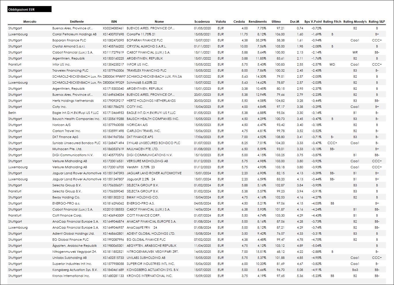 ATTENZIONE: si rammenta che i bond High Yield hanno un rischio spesso non trascurabile in termini di Credit Risk, per cui non sono da considerarsi come suggerimenti operativi, bensì come mere segnalazioni che non saranno poi seguite in modo organico. Pertanto chi decidesse di prendere spunto da tali segnalazioni dovrà poi seguire in via autonoma l’andamento del titolo e le eventuali notizie relative all’emittente, controllando con frequenza il mercato.
