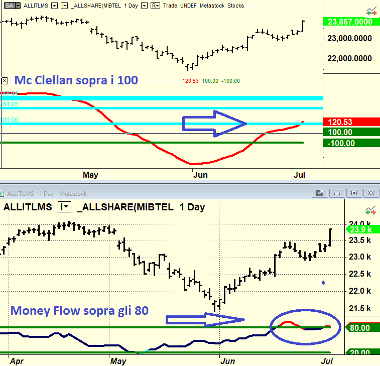 L’Indicatore MC Clellan ha superato la soglia di 100 che di solito è segnale potentemente rialzista. Il Mc Clellan misura il rapporto tra numero di titoli al rialzo e numero di titoli al ribasso ed invariati.