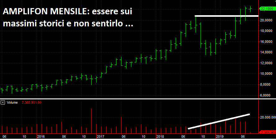 Per quanto riguarda le azioni segnaliamo solo il titolo Amplifon che tecnicamente ha mostrato un grande momentum rompendo una resistenza importante. Stiamo sempre parlando di un titolo che è sui massimi storici e nonostante questo nei 3 ultimi giorni di borsa aperta ha mostrato volumi fuori dall’ordinario. Chi sta comprando ? Perché ? Poco importa la domanda: se i grossi comprano noi piccoli non possiamo fare altro che imitare. E’ sempre un titolo con un ROE 2018 al 16.84% e un ROI al 10.67%.