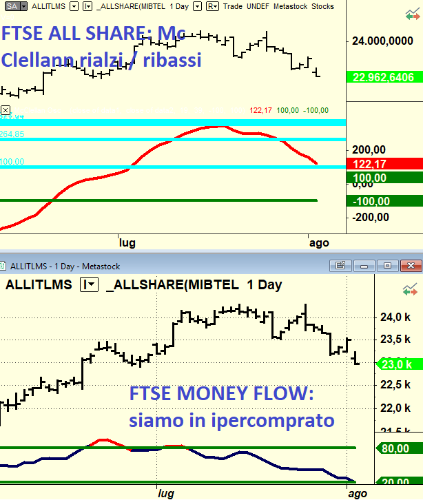 Ma veniamo ai nostri indicatori di sentiment con un Mc Clellan Rialzi / Ribassi che punta verso sud in maniera decisa e con il Money Flow che è appena arrivato a ridosso della zona di ipervenduto. Insomma, questa fase di debolezza non dovrebbe ancora durare molto se siamo già a questo punto …