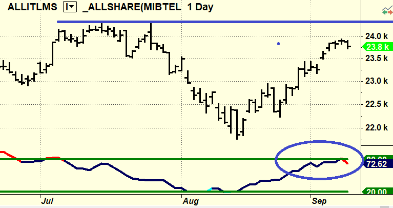 Alla fine basta guardare il nostro Money Flow per sapere in anticipo se il mercato scende oppure no: se guardate il nostro grafico notate come ieri l’altro è andato in ipercomprato e ieri era rosso fuoco. Quindi avremo nei prossimi giorni una congestione / ritracciamento. Ieri sera Wall Street ha chiuso molto bene quindi potrebbe essere una situazione passeggera. Non so se il nostro mercato avrà la forza per rompere la resistenza che abbiamo poco sopra la testa. Stiamo a vedere. Come succedeva in passato siamo in mano alla politica …