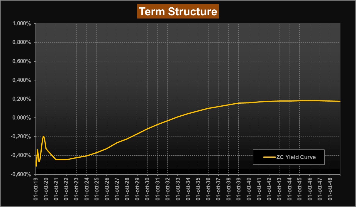 Tornando alle nostre analisi, con la nostra consueta lettura del mercato obbligazionario attraverso la ZC-Yield Curve, registriamo anche questa settimana rendimenti in lieve contrazione. La scorsa rilevazione evidenziava rendimenti negativi sino alle scadenze 2030, ora sino alle scadenze 2032. Il tratto a lunga torna a calare significativamente e si porta in area 0,18% di rendimento contro lo 0,35% della scorsa settimana per le scadenze 2049; sulla scadenza a 10 anni si scende ancora in area -0,17%. Curva che torna ad appiattirsi in modo significativo e che rimane decisamente “nervosa” nella parte a breve. Scendono leggermente anche i forward su Euribor 6 mesi che sul tratto a lunga si attestano ora poco sopra area 0,50% e sul tratto a breve ritornano verso area -0,70%.