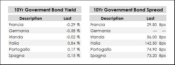Tornano a contrarsi anche i rendimenti dei decennali e gli spread contro Bund: il decennale tedesco -0,58% di rendimento attuale contro -0,48% della scorsa rilevazione, la Francia va a -0,29% e l’Irlanda va a -0,02%. Scendono anche i rendimenti di Spagna, Portogallo e Italia, con il Btp che cala in area 0,84%, mentre il Portogallo va a 0,17% e la Spagna scende allo 0,15%. A livello di spread Vs Bund abbiamo Portogallo, Spagna e Italia rispettivamente a 75 bps, 73 bps e 142 bps.