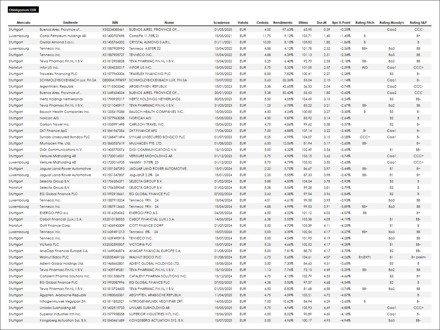 ATTENZIONE: si rammenta che i bond High Yield hanno un rischio spesso non trascurabile in termini di Credit Risk, per cui non sono da considerarsi come suggerimenti operativi, bensì come mere segnalazioni che non saranno poi seguite in modo organico. Pertanto chi decidesse di prendere spunto da tali segnalazioni dovrà poi seguire in via autonoma l’andamento del titolo e le eventuali notizie relative all’emittente, controllando con frequenza il mercato.