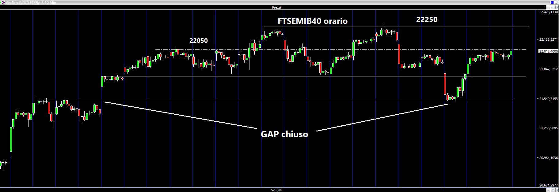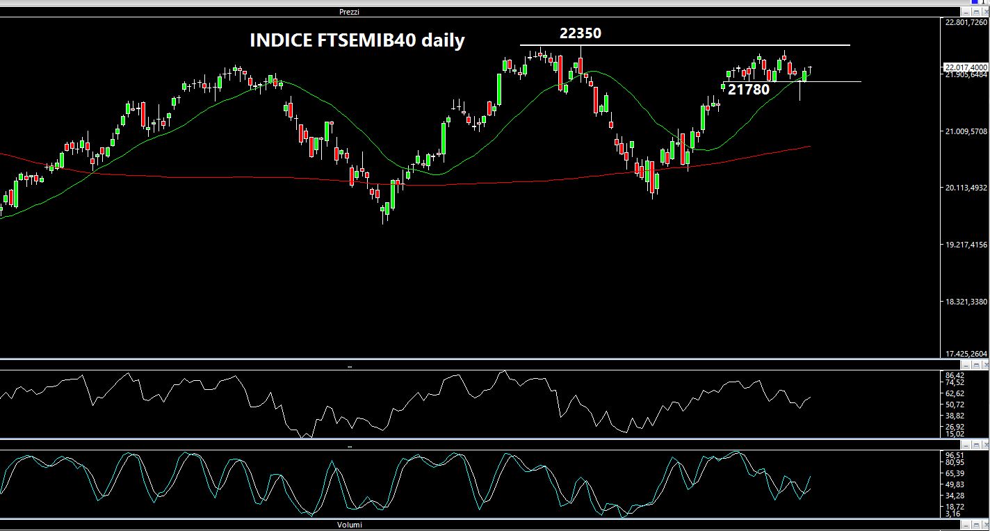 Il grafico daily presenta fondamentalmente il massimo dei 22350 ed il "solito" supporto dei 21780 punti. Andando a vedere il chart orario continuerei ad utilizzare il supporto dei 21780 punti, un'area mediana sui cui i prezzi hanno "lavorato" parecchie volte e che colloco a 22050 (linea tratteggiata bianca) ed infine i 22250 punti che se rotti ci potrebbero proiettare effettivamente all'attacco dei massimi. Questo per quanto riguarda l'Italia.