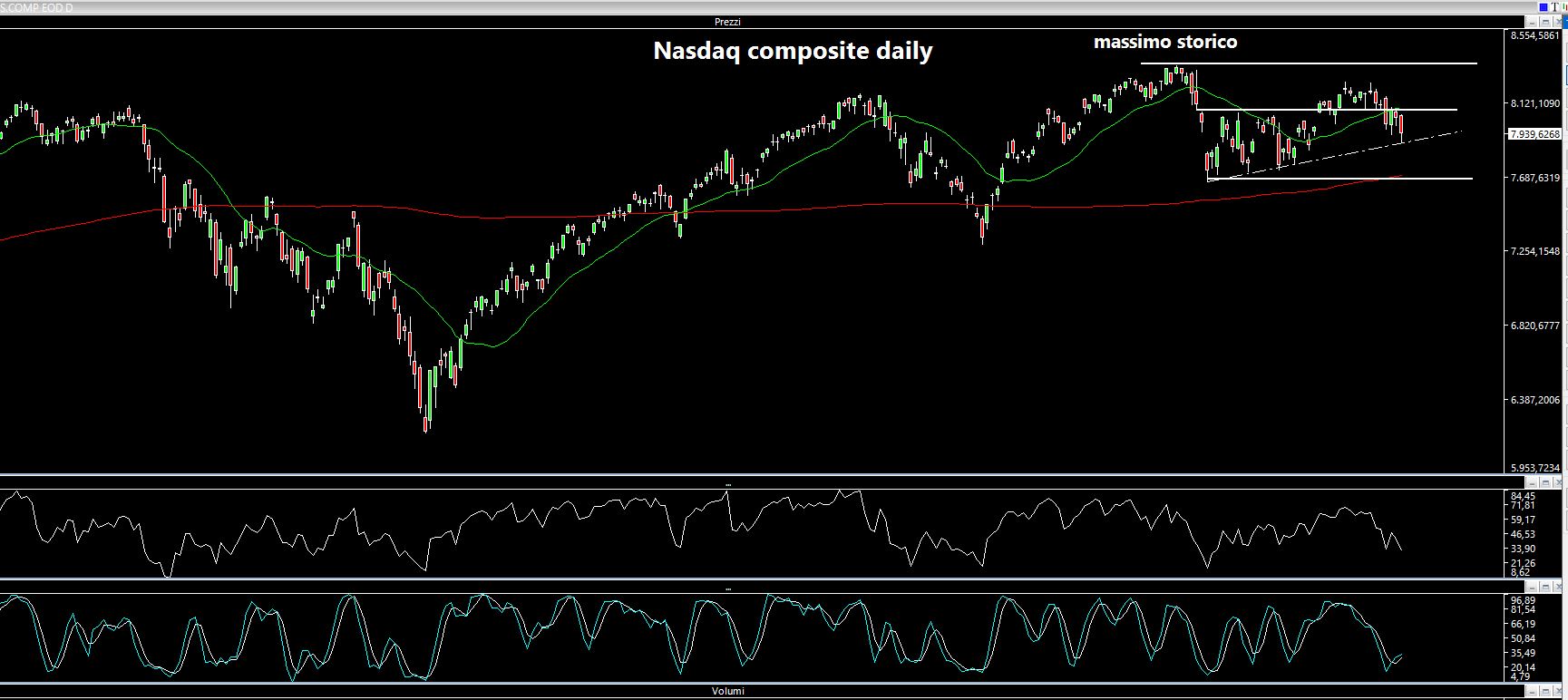 Il quadro macro (dazi con Trump che oggi pare voglia escludere le compagnie cinesi da Wall Street, politica internazionale, Brexit, possibilità di impeachment etc..) però non mi convince: se l'Italia è forte, non lo sono ad esempio gli Stati Uniti. Anche questa settimana sono state fatte ulteriori aste di rifinanziamento di cui avevo già parlato sabato scorso (https://www.lombardreport.com/2019/9/21/aaaa-2/) e di cui pochi scrivono. Ebbene, la Fed ha deciso di prorogare al 10 ottobre le aste repo, attraverso iniezioni di liquidità da 90 miliardi a settimana per un totale di circa 140 miliardi di euro nel sistema. Ora, negli ultimi dieci anni (dal 2008, anno dell'inizio della crisi) la Fed non era mai dovuta intervenire con tale forza. Fondamentalmente ci si domanda il motivo che spinge le banche a non prestare soldi ad altre banche che ne hanno necessità a breve. In altri termini se ci sono problemi nell'interbancario e se la Fed presta a un giorno è come se ci fosse sfiducia sul fatto che qualcuno possa non adempiere alla restituzione ADDIRITTURA il giorno successivo. Insomma, è un campanello di allarme associato a cose che ho scritto nelle settimane passate. Proviamo a guardare l'indice Nasdaq Composite sia sul daily che sul weekly. Nel primo grafico notiamo come ci sia stato un tentativo, per ora fallito, di uscire dalla fase di incertezza e lateralità che lo aveva caratterizzato dal mese di agosto. Settimane di incertezza colme di gap up and down. A logica ci sarebbe potuto essere un attacco ai massimi storici di area 8350 punti, cosa che per ora non si è concretizzata.