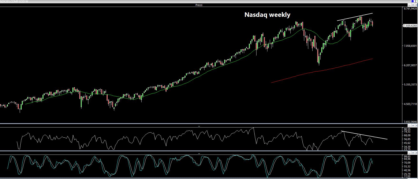 Sul settimanale direi che è evidente la presenza di una divergenza ribassista per chi è amante dell'analisi tecnica o degli oscillatori, che non uso ma che talvolta mi diletto ad osservare.