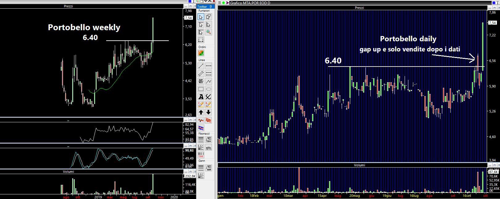 Naturalmente come tutti i titoli dell'AIM anche in questo caso siamo in balìa di spread ampi ed improvvise "spazzolate" in acquisto o in vendita. Pessimo sarebbe un ritorno sotto i 5.90 euro dai 7.54 di chiusura di venerdì. Mi rendo conto che gli stop sono larghissimi, ma come sempre è la size bassa che permette di ridurre il rischio finanziario. In questo caso il quantitativo minimo di pezzi tradabili è 300, quindi circa 2400 euro di controvalore. Un euro e mezzo di stop significa permettersi una perdita attorno ai 450 euro. Questo lo dico perché non sono un amante dei titoli dell'AIM in generale, pur ammettendo che ci sono belle realtà di cui abbiamo parlato spesso nei mesi passati, da Pattern a Officina Stellare.