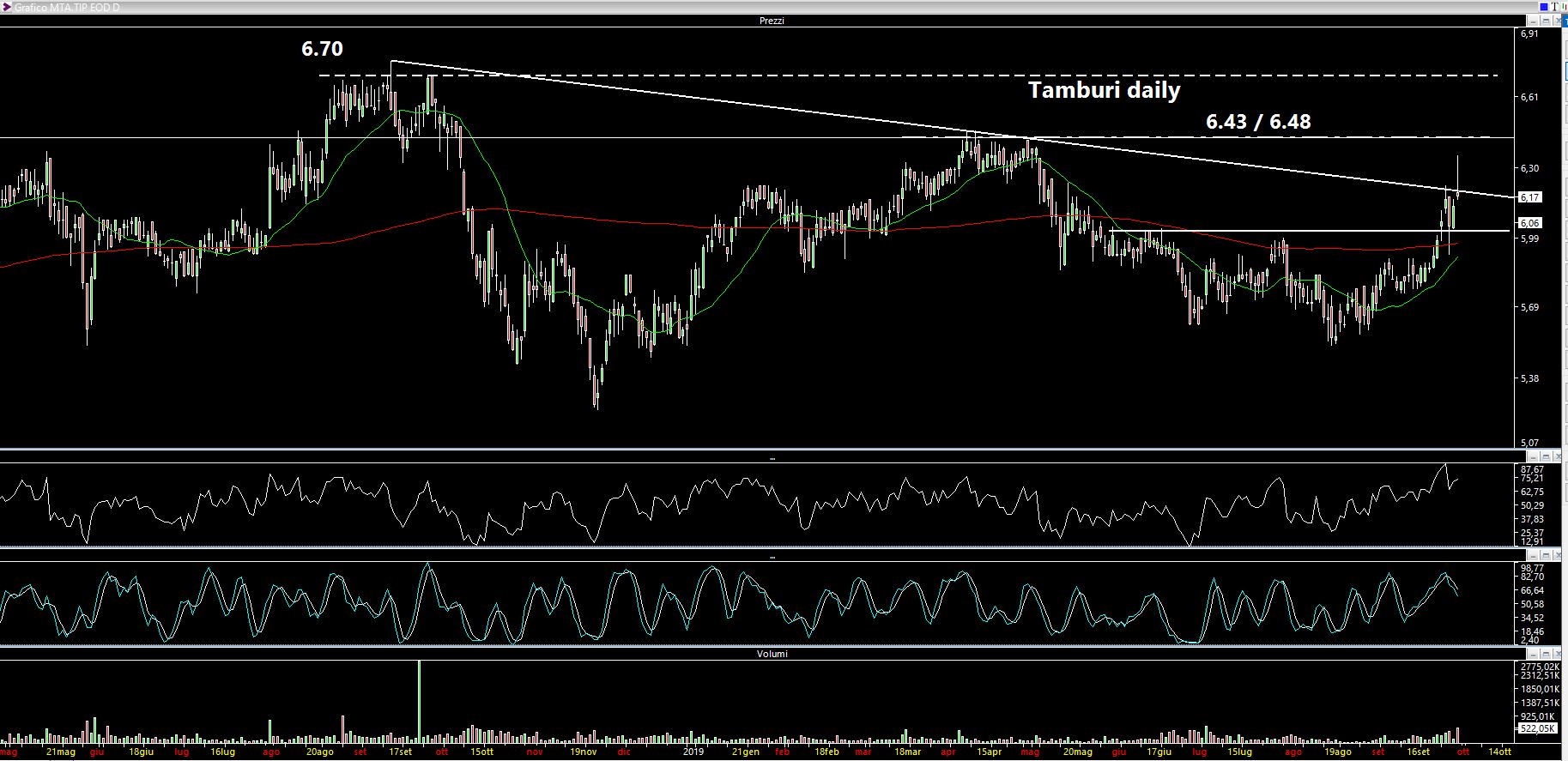 In settimana è uscita la notizia che Tamburi, noto finanziere, procederà ad acquistare 8 milioni di azioni entro il 31 Gennaio 2020. Titolo più da posizione che da trading stretto. Ad occhio e croce sono un centinaio di sedute di Borsa, quindi circa 80 mila pezzi al giorno (che non sono pochi). Questa naturalmente NON è garanzia che il titolo debba salire a tutti i costi visto che ci muoviamo in un contesto macro, ma è una sorta di paracadute a mio modo di vedere.