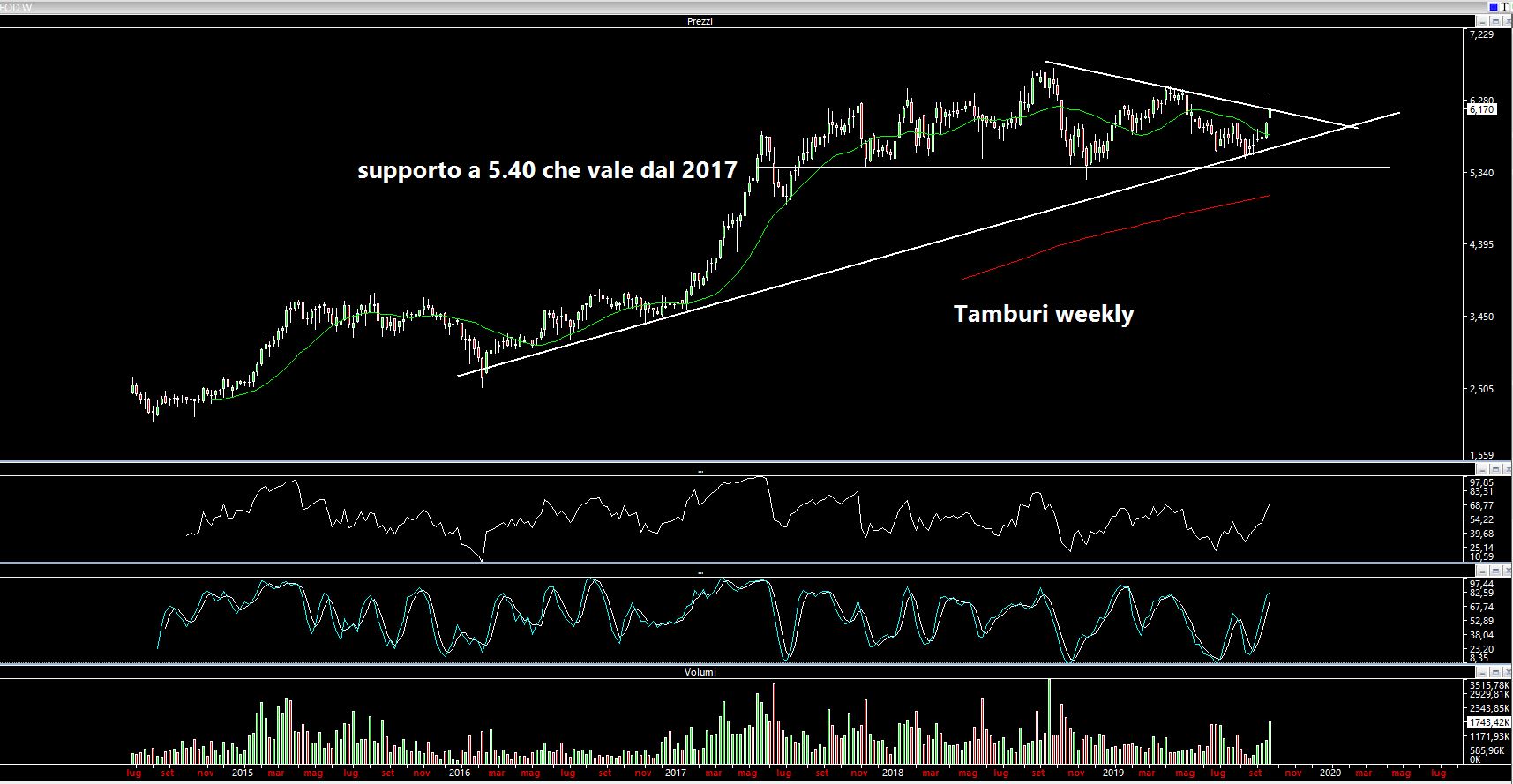 Graficamente vedo due forti resistenze: una a 6.43 euro circa e l'altra a 6.70 euro. Ieri (venerdì) è stata rotta in volatilità la trendline dinamica discendente e la chiusura è stata leggermente sotto. De facto si tratterebbe di una rottura non confermata quindi. Abbiamo un buon supporto grafico attorno a 6.05 euro. Il grafico weekly mostra invece una fase laterale che si protrae ormai dal 2017 ma che avviene comunque dopo una spinta rialzista del titolo e con oscillatori ben impostati. Il supporto di lunghissimo periodo è invece posto a 5.40 euro, ma naturalmente solo un evento particolarmente avverso potrebbe farlo tornare in auge.