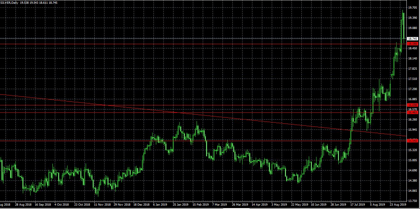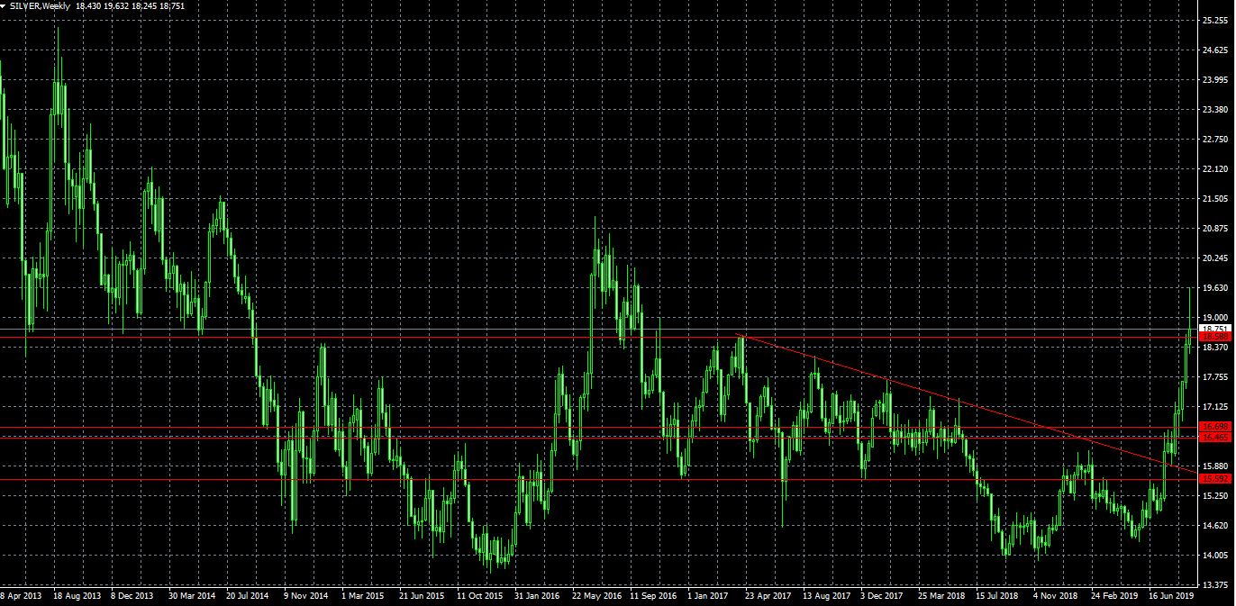 Mentre scrivo il silver sta ritracciando e sta toccando millimetricamente un bel livello (18.60/18.70). Eccolo servito sia sul daily (primo grafico) che sul weekly (secondo chart). Un pò di respiro era doveroso e salutare!