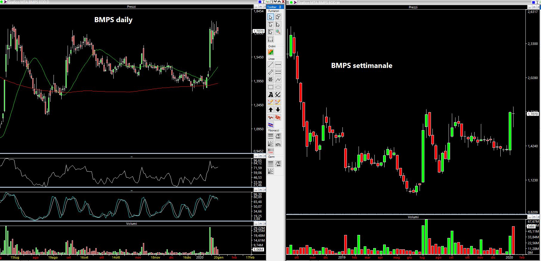 Ottima performance settimanale con discreti volumi. Resistenza principale in area 9.90/10.00 euro che potrebbe portare al test dell'area 11.50 circa visibile sul mensile.